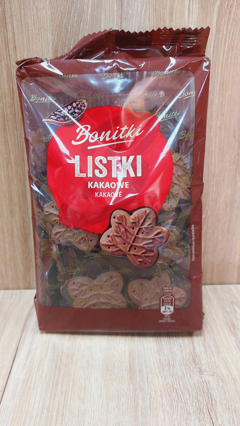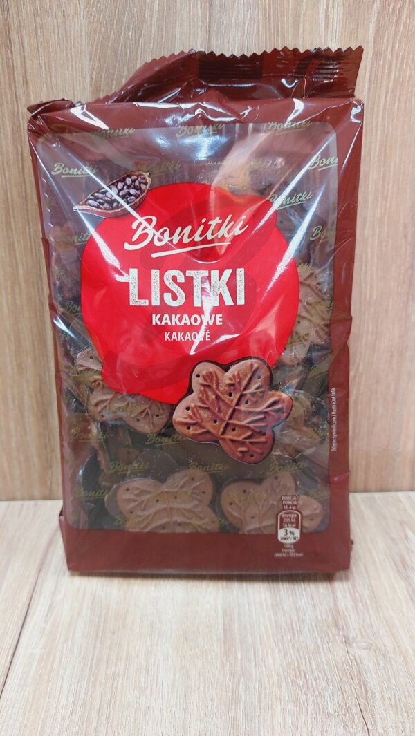 «Bonitki Listki Kakaowe» – це здобне шоколадне печиво у формі листочка, виготовлене в Польщі. Воно має ніжне тісто з додаванням какао та покрите зверху шматочком темного молочного шоколаду. Це печиво добре поєднується з кавою або чаєм і підходить для перекусу, оскільки упаковане в пластикову ванну та цефляновий пакет для зручності.