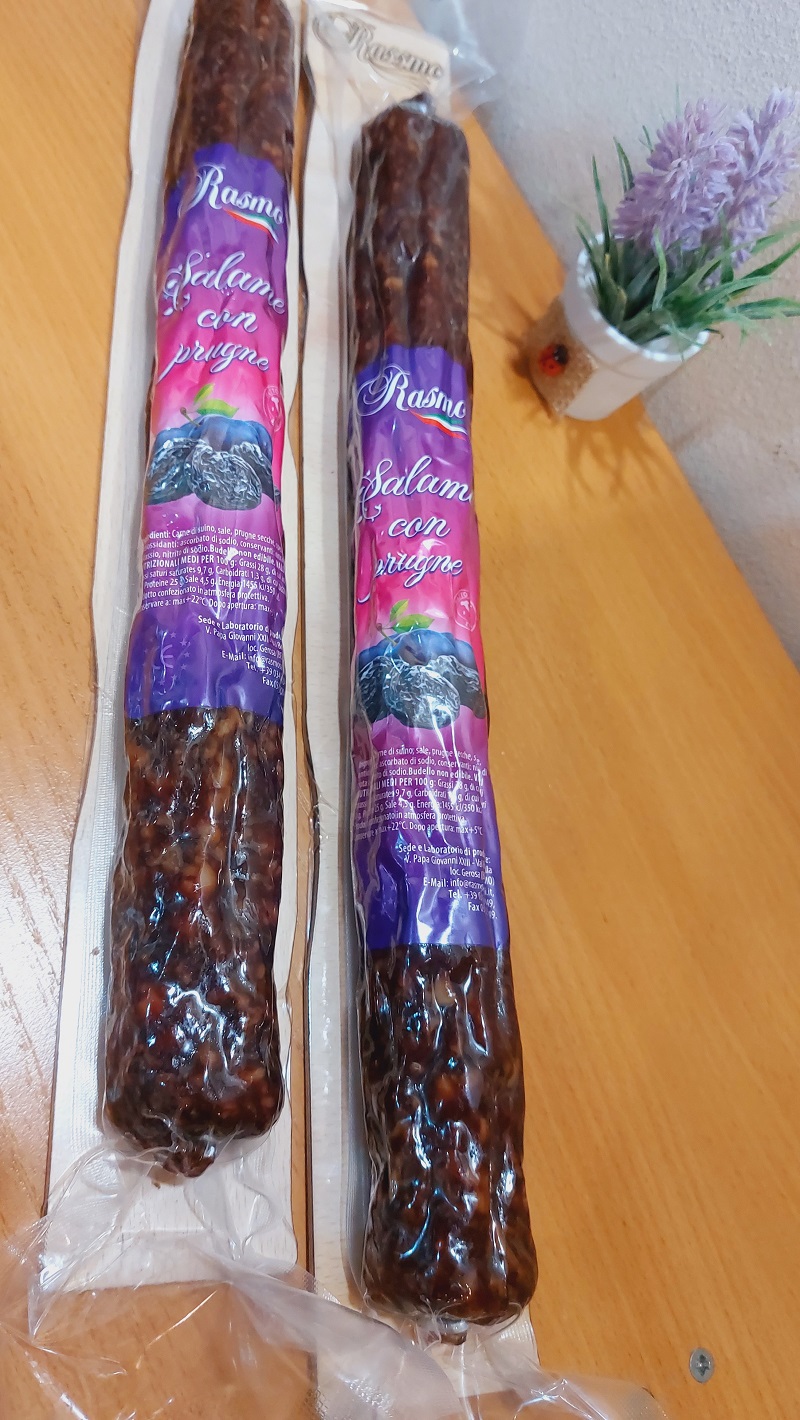 Rasmo Salame con Prugne — це італійська сиров’ялена салямі з чорносливом (приблизно 260–300 г), яка має вишуканий м’ясний смак із солодкувато-фруктовими нотками. Виготовляється за традиційними рецептурами, має щільну текстуру та чудово підходить для м’ясної нарізки чи гурманів.