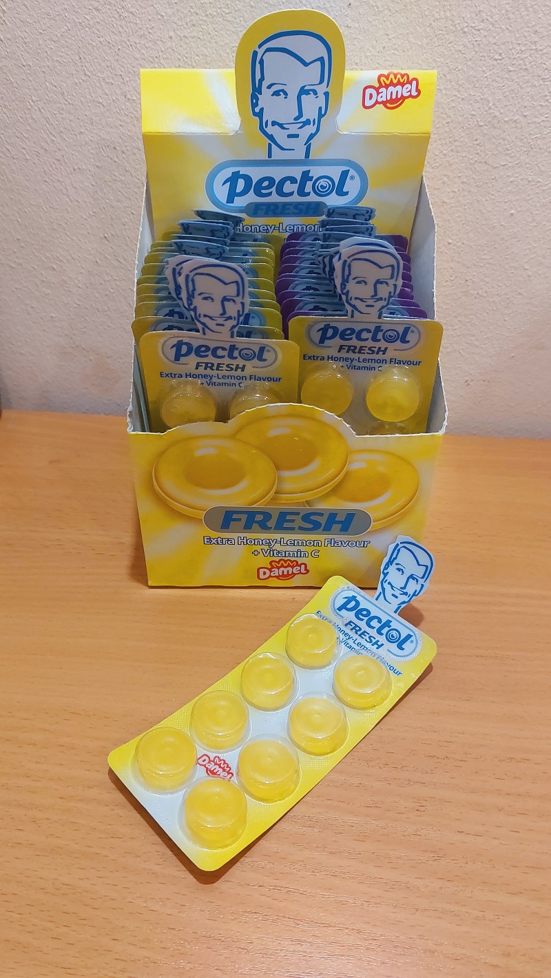Льодяники Damel Pectol медово-лимонні з вітаміном C — це цукерки з вибуховим смаком лимона та меду, що містять справжній мед і вітамін C. Вони не є лікарським засобом, але можуть підняти настрій, і продаються у зручній плоскій упаковці, яку легко носити з собою.