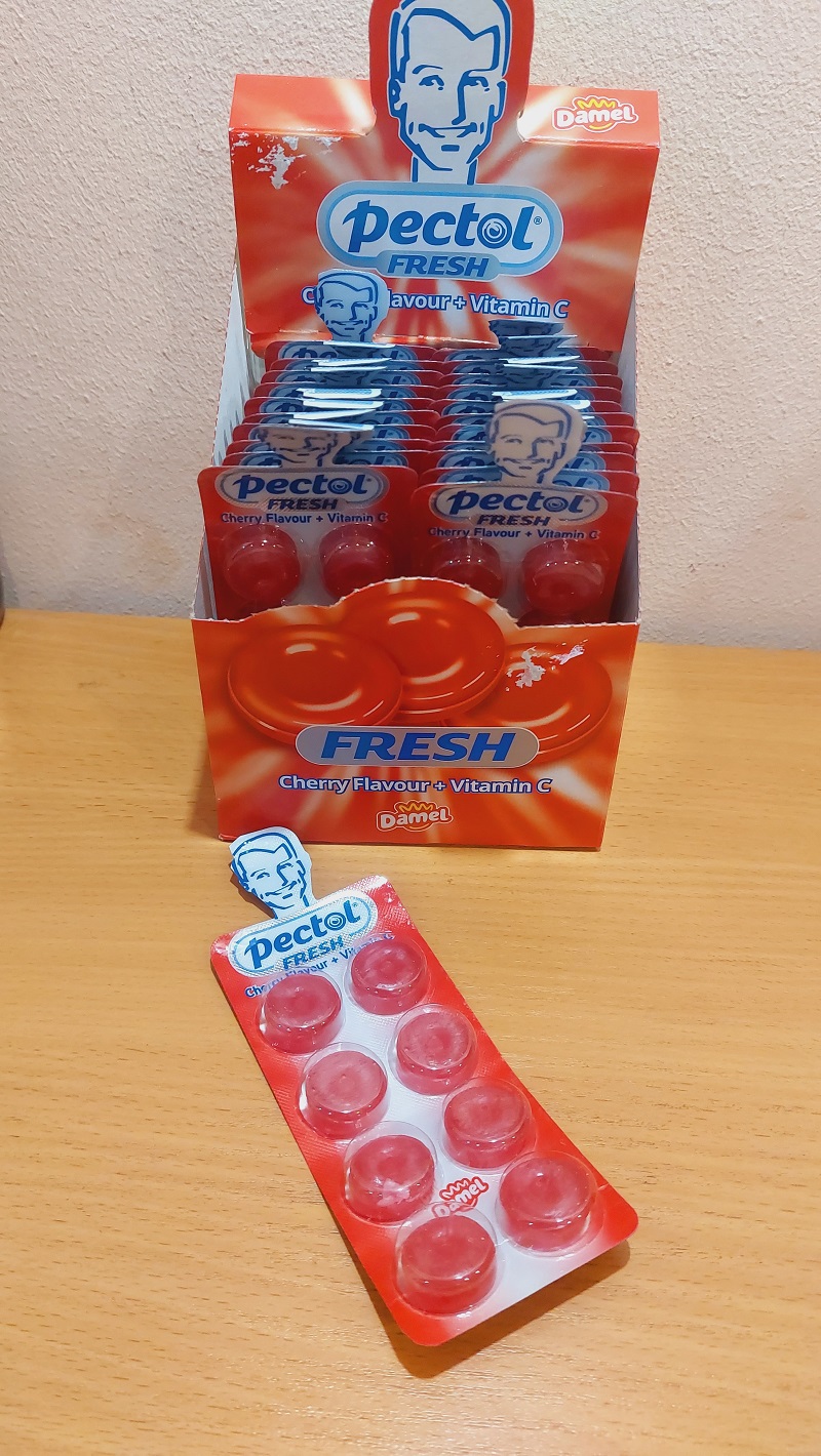 Цукерки Pectol з вишневим смаком у пластинках по 20 г – надійна доза радості у вашій кишені.