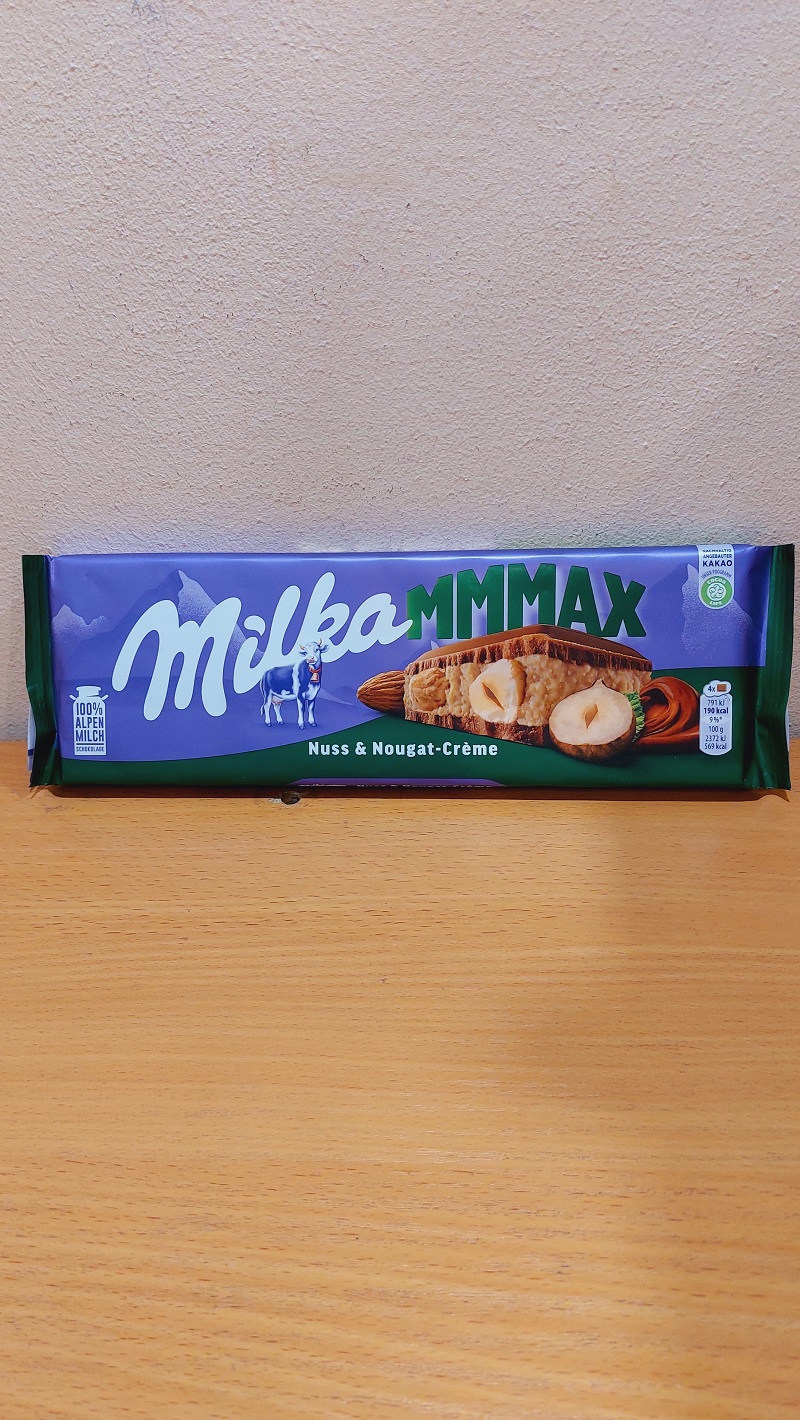 Milka Nuss Nougat Cream — це молочний шоколад з начинкою з горіхового крему та нуги, що містить цільні лісові горіхи. Цей продукт відомий як Milka MMMAX Nuss Nougat Creme і випускається вагою 300 грамів, поєднуючи ніжний смак альпійського молока, фундука та нуги.