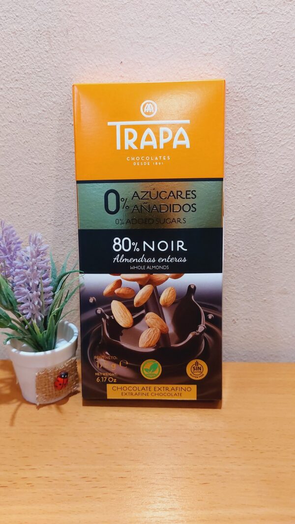 Темний шоколад 80% без цукру з мигдалем Trapa, 175г, – це іспанський шоколад, що містить 80% какао, без доданого цукру (замість нього використовується мальтит) і з цільним мигдалем.